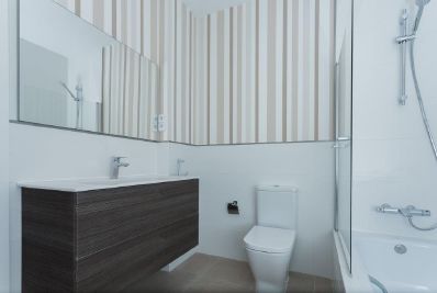 baño con inodoro, bidet y plato ducha con fijo cristal